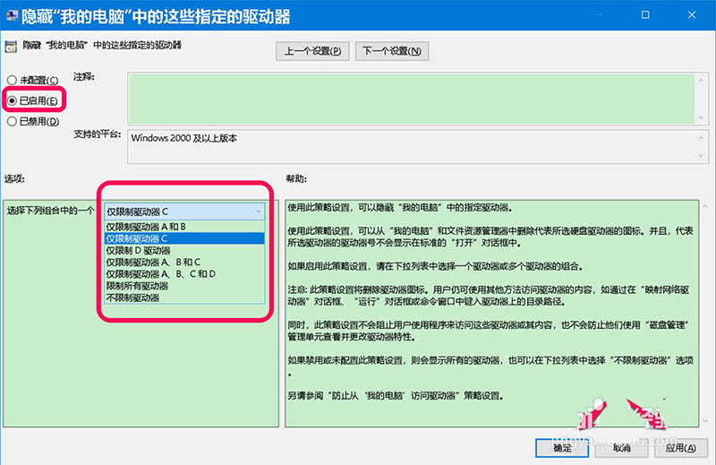 我們將運行狀態(tài)更改為:已啟用,并在選項 - 選擇下列組合中的一個框中選擇【僅限制驅(qū)動器C】,再點擊:應(yīng)用 - 確定;