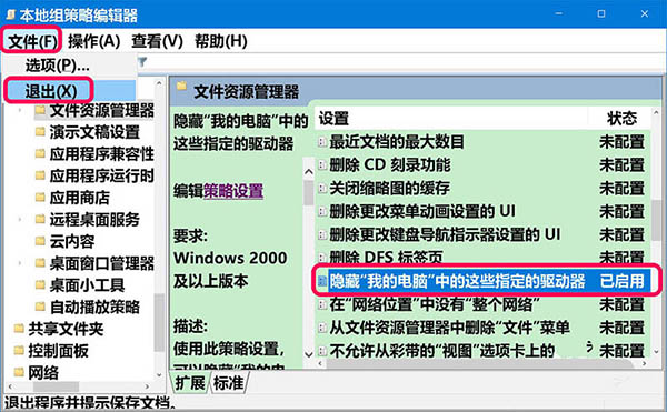 點擊窗口左上角的【文件】 - 【退出】,退出組策略編輯器。