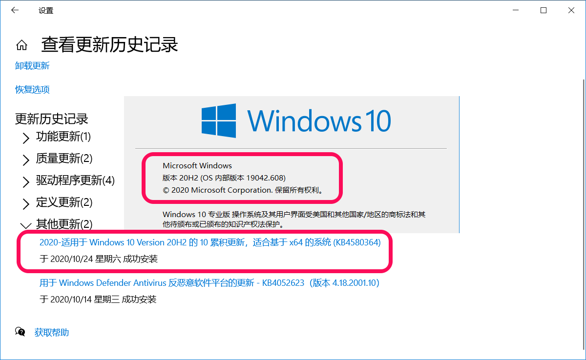 版本 20H2(OS 內(nèi)部版本 19042.608)