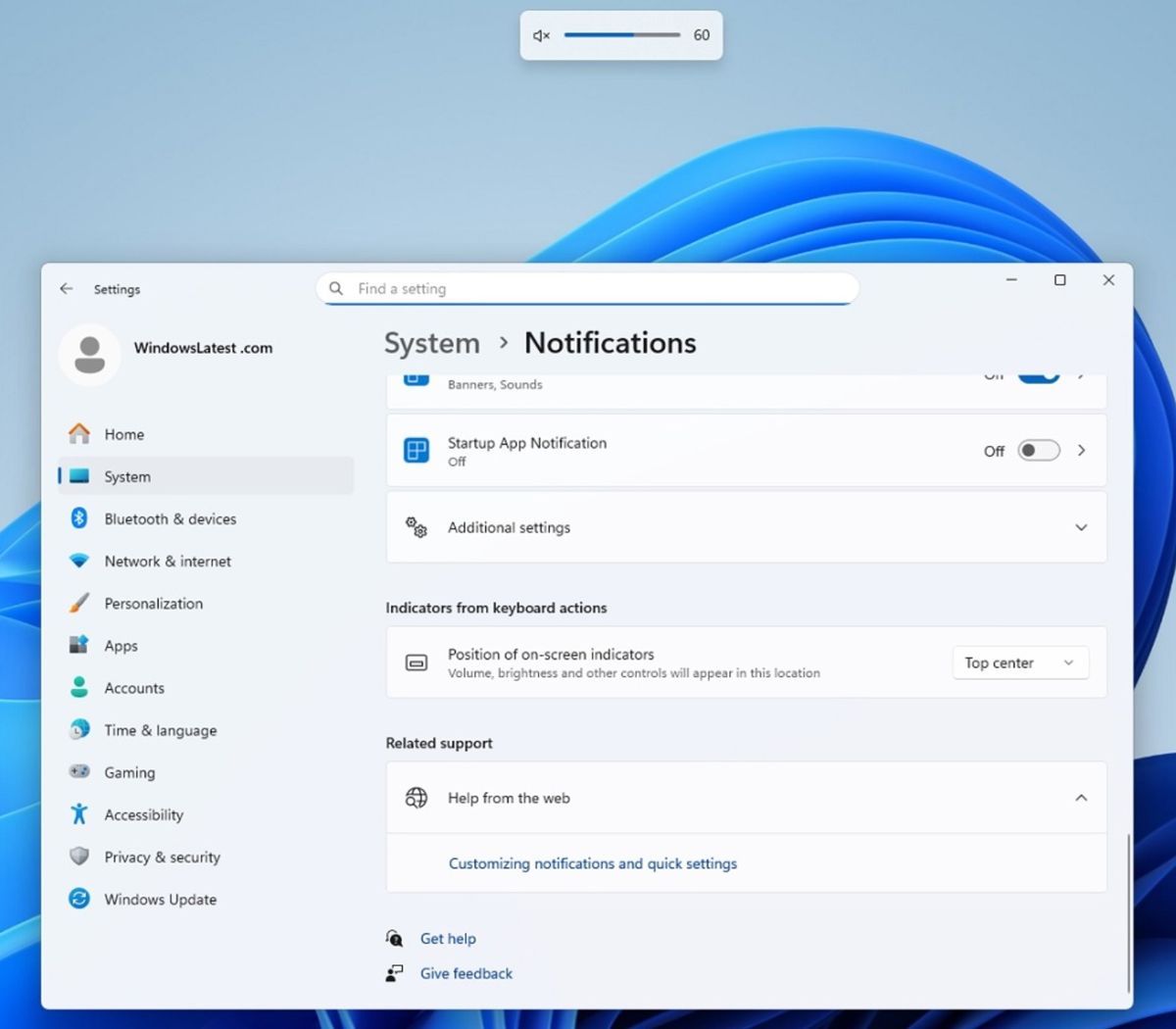 微軟提升了個(gè)性化體驗(yàn),用戶現(xiàn)在可以通過“設(shè)置 > 系統(tǒng) > 通知”中的新開關(guān),自由地將這些指示器設(shè)置在屏幕的左上角、頂部中央或默認(rèn)的底部中央三個(gè)位置。
