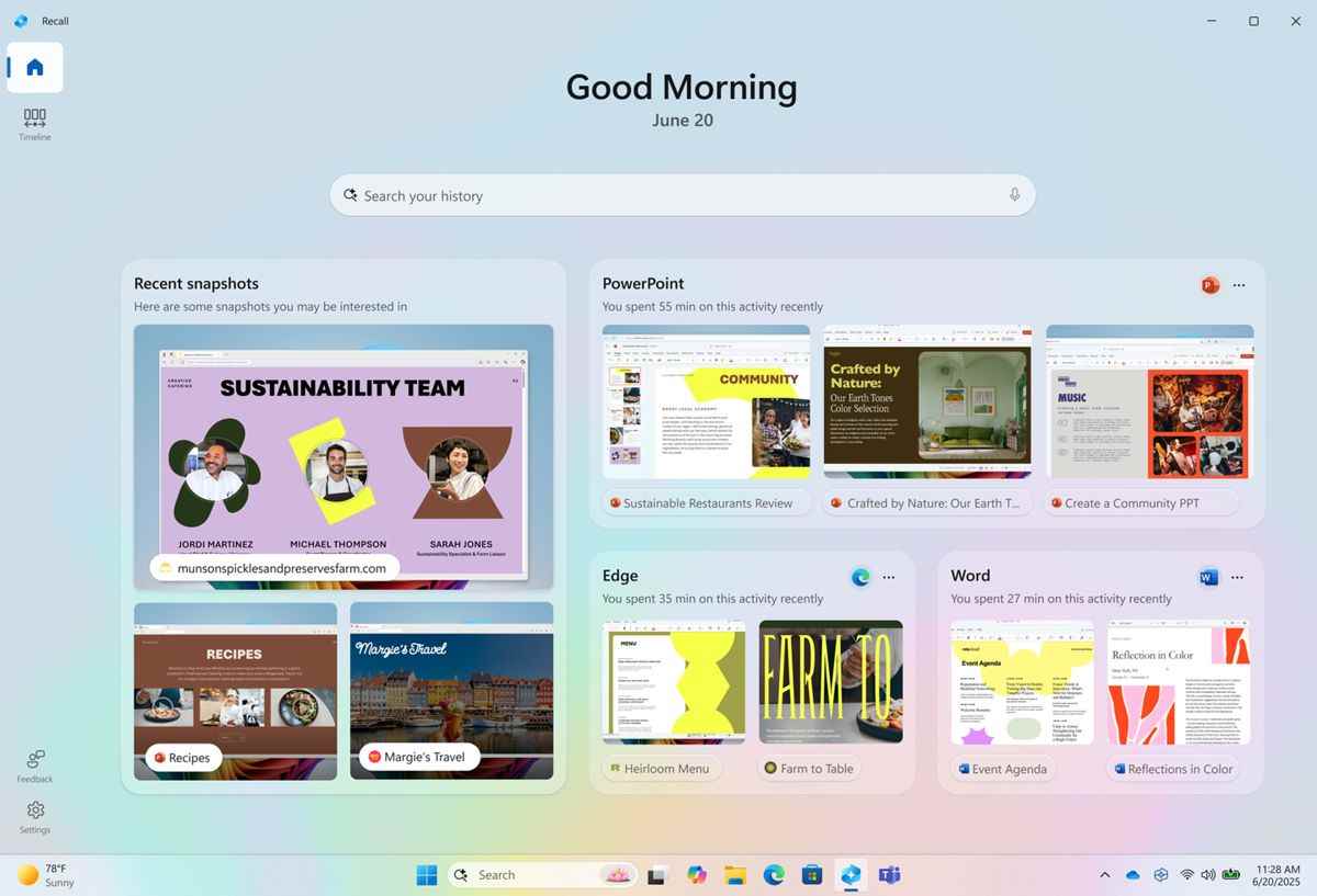 Copilot+ 電腦的 Recall(預覽版)主頁新增“快照”和“常用應用”板塊,方便用戶快速恢復最近任務。