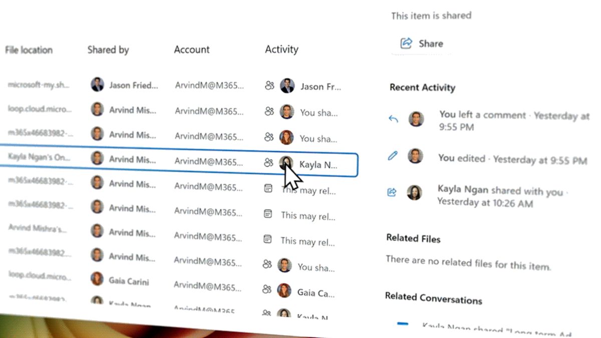 企業(yè)用戶登錄后,文件資源管理器首頁的“推薦”和“活動”區(qū)域將顯示協(xié)作者頭像,懸停即可查看 Microsoft 365 聯(lián)系卡,了解文件關聯(lián)人員信息。