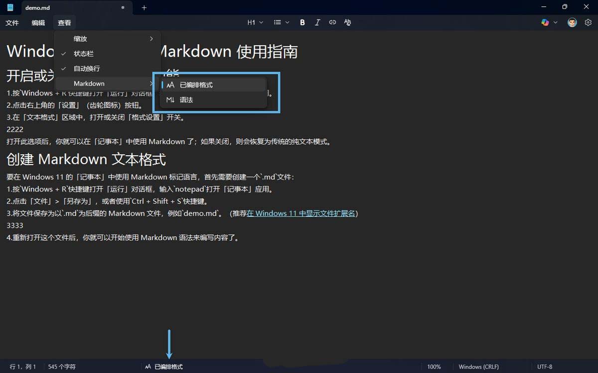 1、切換 Markdown 視圖:在「記事本」的「查看」>「Markdown」菜單或狀態(tài)欄中,你可以選擇: