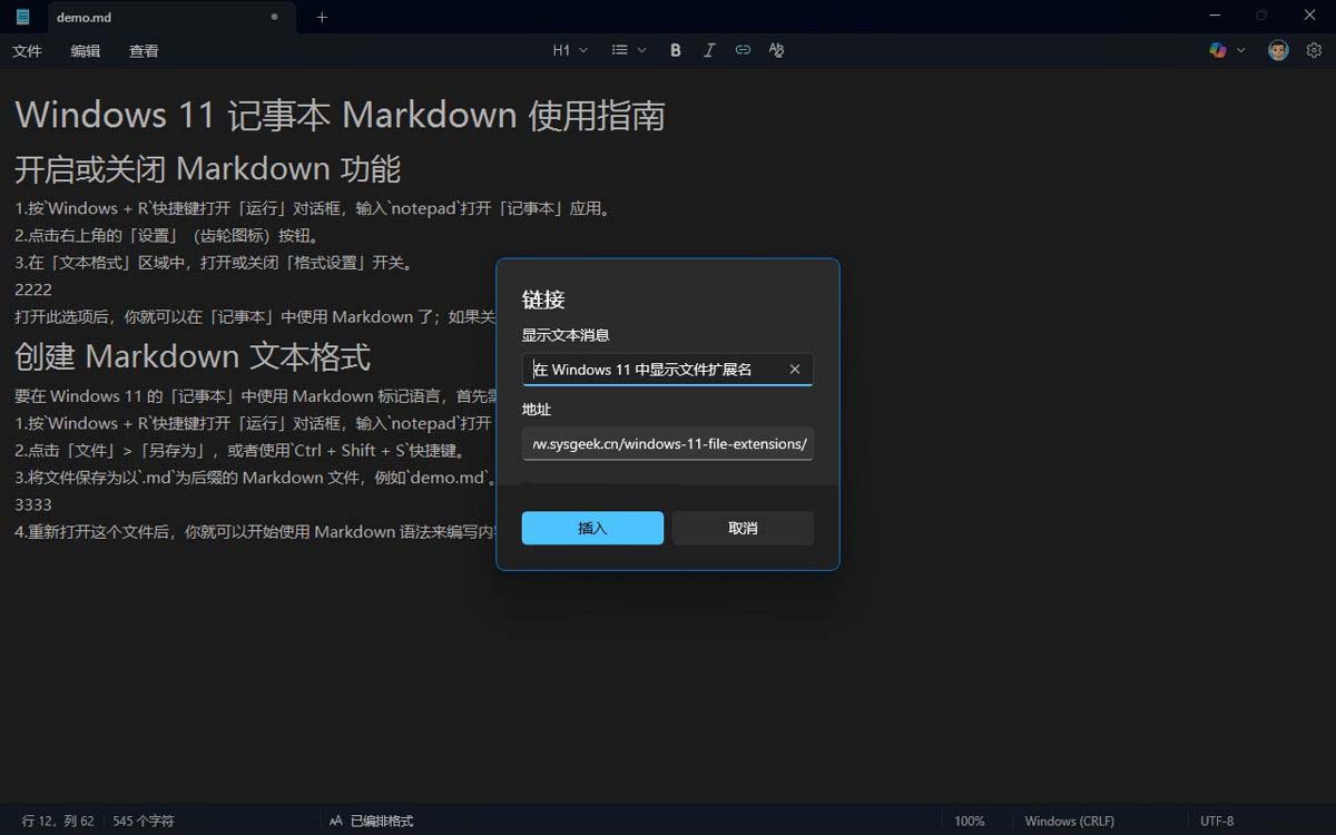 ),在彈窗中輸入網(wǎng)頁地址,然后點擊「插入」即可。如果你處于「語法」模式,也可以使用[鏈接文本](https://demo.com)