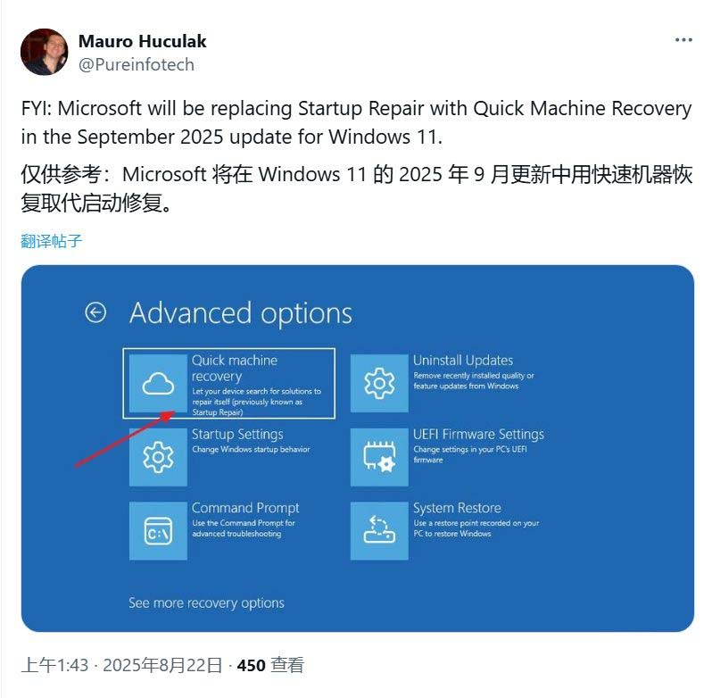 科技媒體 borncity 昨日(8 月 24 日)發(fā)布博文,報(bào)道稱微軟計(jì)劃在下月(2025 年 9 月)發(fā)布的累積更新中,調(diào)整 Windows 11 系統(tǒng)中的恢復(fù)環(huán)境(WinRE),用“快速計(jì)算機(jī)恢復(fù)”(Quick Machine Recovery,QMR)替換現(xiàn)有“啟動(dòng)修復(fù)”(Startup Repair)功能。