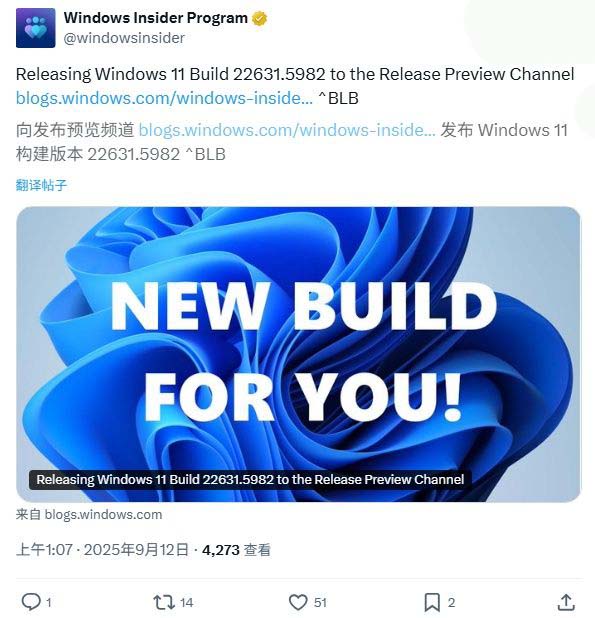 微軟今日宣布向 Release Preview 頻道的 23H2 用戶(hù)推送了 Win11 Build 22631.5982(KB5065790)。