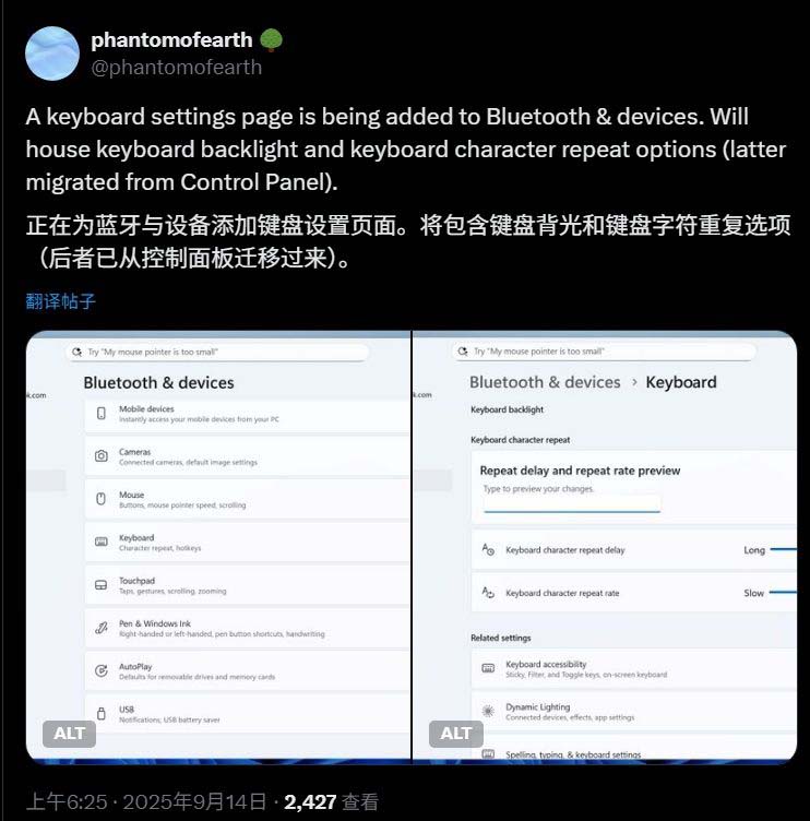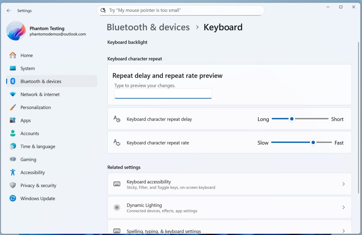 X 平臺(tái)用戶 @phantomofearth 昨日發(fā)現(xiàn),來自 Dev 和 Beta 預(yù)覽渠道的最新 Windows 11 版本中有一個(gè)新的隱藏鍵盤設(shè)置,允許用戶更改字符重復(fù)選項(xiàng),即重復(fù)延遲和重復(fù)速率。