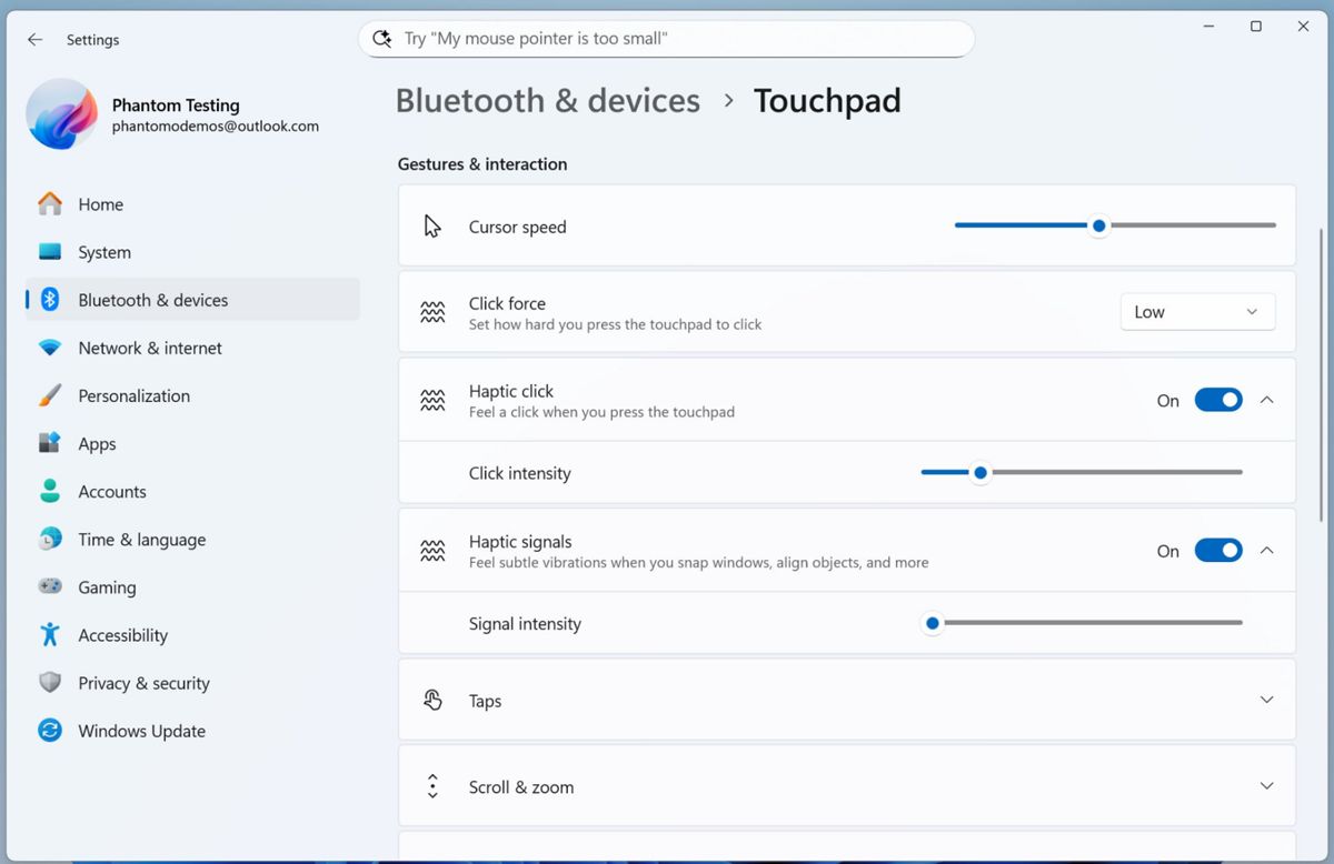 此外,Windows 11 的設(shè)置應(yīng)用中,觸控板觸覺反饋設(shè)置也將更新。點(diǎn)擊力度 / 靈敏度將改為下拉菜單而非滑塊,觸覺點(diǎn)擊和觸覺信號(hào)將分別有獨(dú)立的開關(guān)和滑塊。