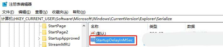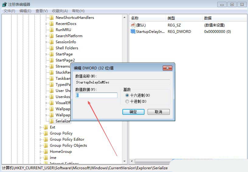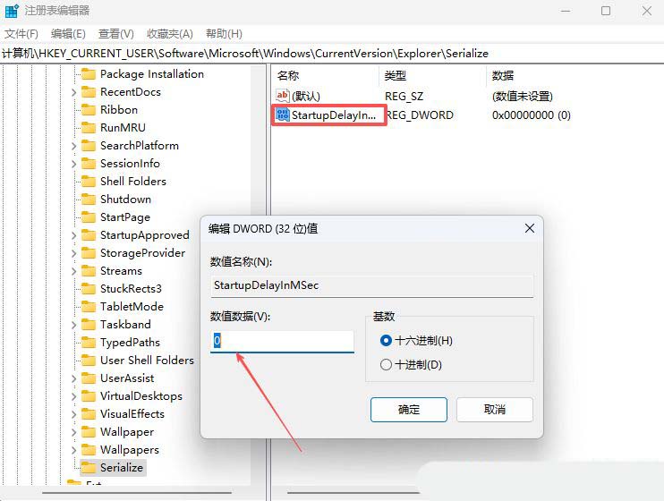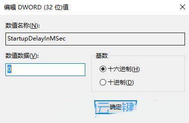 6、最后,雙擊打開StartupDelayInMSec,在編輯 DWORD (32 位)值窗口中,將數(shù)值數(shù)據(jù)設(shè)置為 0 ,并確定即可;
