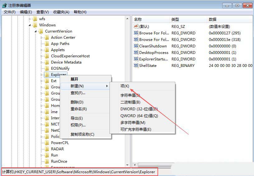 3、右鍵點(diǎn)擊Explorer,在打開的菜單項中,選擇新建 - 項,并將新建的項,重命名為Serialize,如果Serialize項已存在,則跳過此步驟;