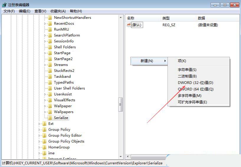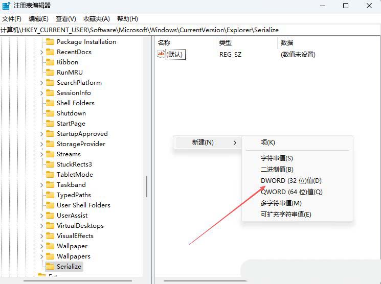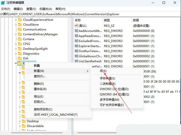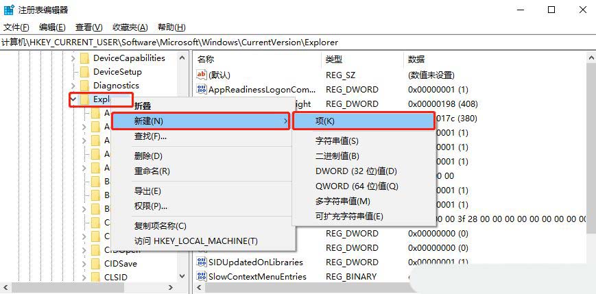 2、接著,在打開的界面中,依次點(diǎn)擊打開“HKEY_CURRENT_USERSoftwareMicrosoftWindowsCurrentVersionExplorer”,并右鍵點(diǎn)擊“Explorer”,選擇新建一個名為“Serialize”的項。
