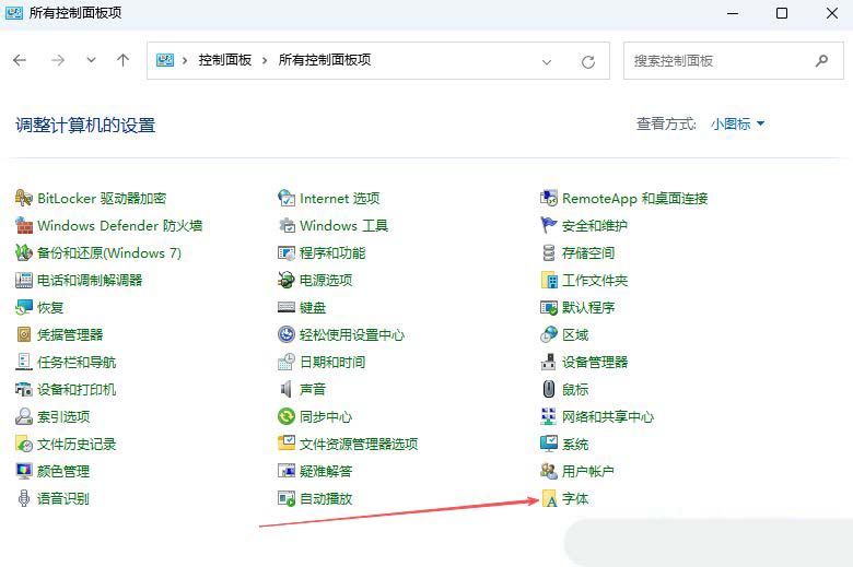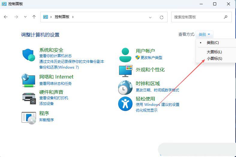 1、首先,打開Win11系統(tǒng)的控制面板界面,并設(shè)置“查看方式”為“小圖標(biāo)”。
