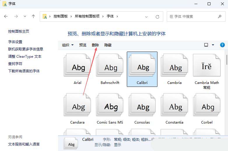 4、最后,選擇好所需要?jiǎng)h除的字體后,點(diǎn)擊上面的“刪除”即可。