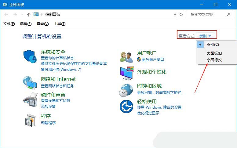 1、首先,打開Win10系統(tǒng)的控制面板界面,并設(shè)置“查看方式”為“小圖標(biāo)”。