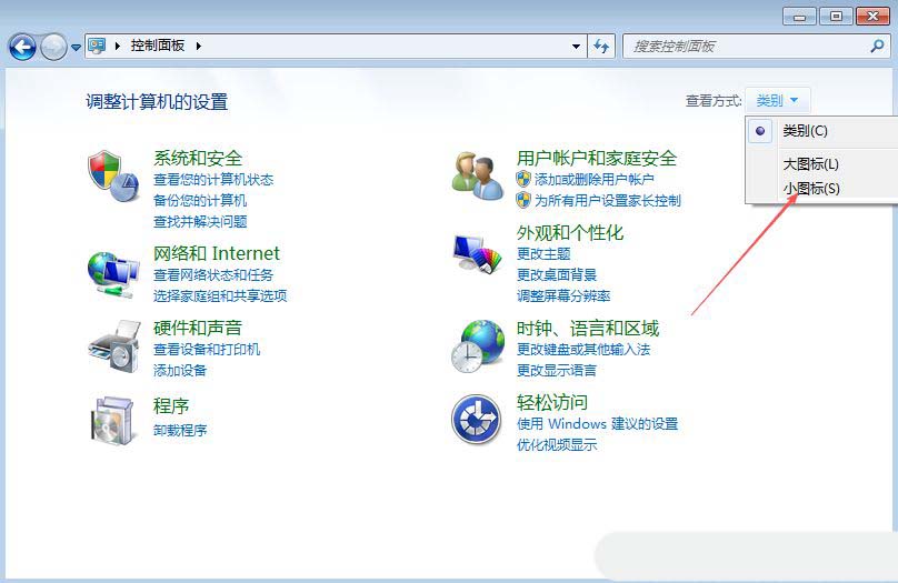 1、首先,打開Win7系統(tǒng)的控制面板界面,設(shè)置“查看方式”為“小圖標(biāo)”。