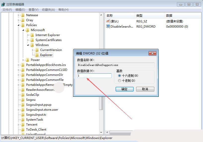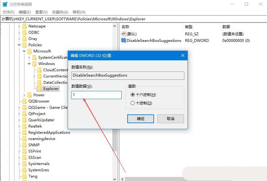 5、此時(shí),雙擊打開剛創(chuàng)建的“DisableSearchBoxSuggestions”值,設(shè)置其“數(shù)值數(shù)據(jù)”值為1,再點(diǎn)擊確定即可。