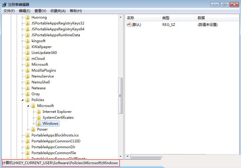 2、接著,在打開的界面中,依次點(diǎn)擊展開“計(jì)算機(jī)HKEY_CURRENT_USERSoftwarePoliciesMicrosoftWindows”。