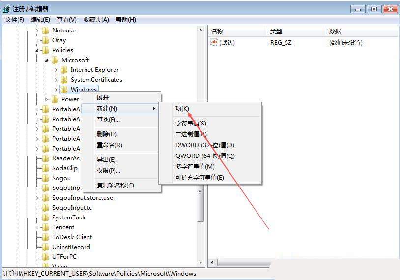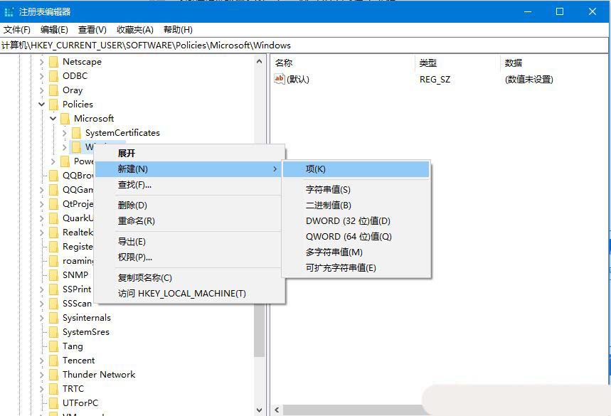 3、然后,右鍵點(diǎn)擊“Windows”項(xiàng),選擇新建一個(gè)“項(xiàng)”,并將其命名為“Explorer”。