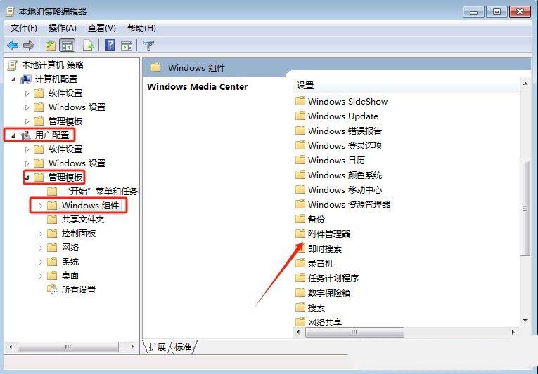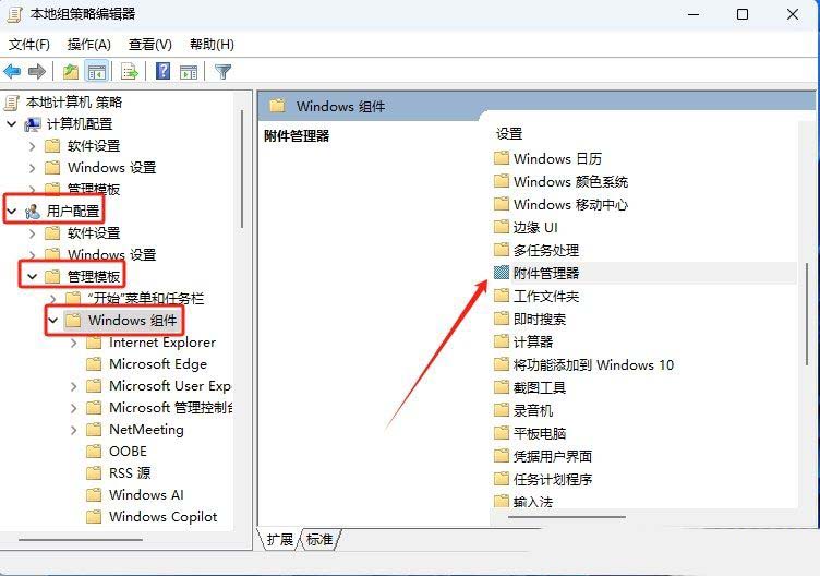 2、接著,在打開的界面中,依次點擊展開“用戶配置-管理模板-Windows 組件-附件管理器”。