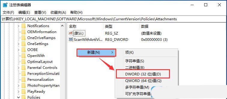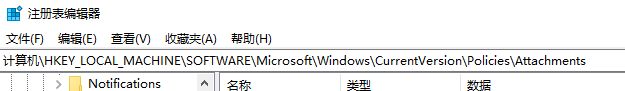2、注冊表編輯器窗口,依次展開到以下路徑:HKEY_LOCAL_MACHINESOFTWAREMicrosoftWindowsCurrentVersionPoliciesAttachments