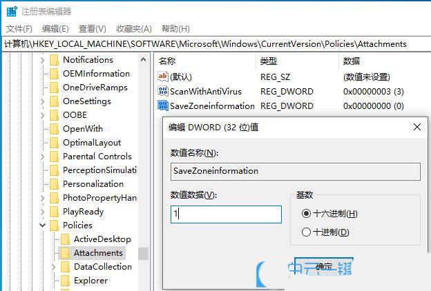 4、最后,將這個新建DWORD (32 位)值(D)命名為【SaveZoneinformation】,并雙擊打開,將數(shù)值數(shù)據(jù)修改為【1】;