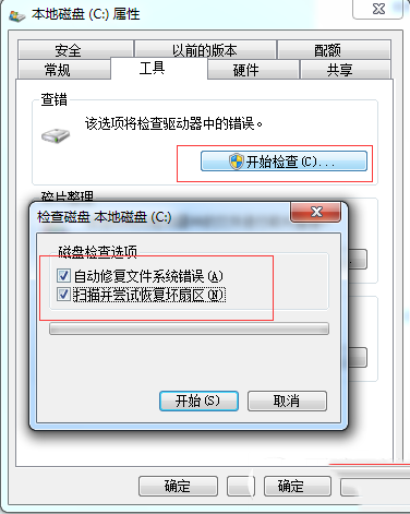 2、選擇工具標(biāo)簽,點(diǎn)擊查錯(cuò)里的開(kāi)始檢查,然后勾上下圖紅框內(nèi)的兩個(gè)選項(xiàng),并點(diǎn)擊開(kāi)始;