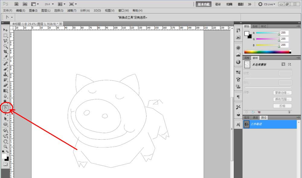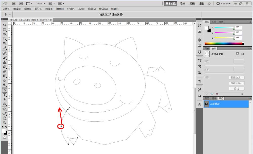4、點擊【鋼筆工具】,繼續(xù)在圖示位置繪制出另外幾個線段圖案。點擊【轉(zhuǎn)換工具】,鼠標(biāo)點擊拉動節(jié)點,同樣將圖案上的節(jié)點曲線化,完成圖案的節(jié)點平滑處理,完成卡通豬身體部位的繪制(如圖所示);