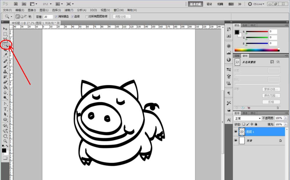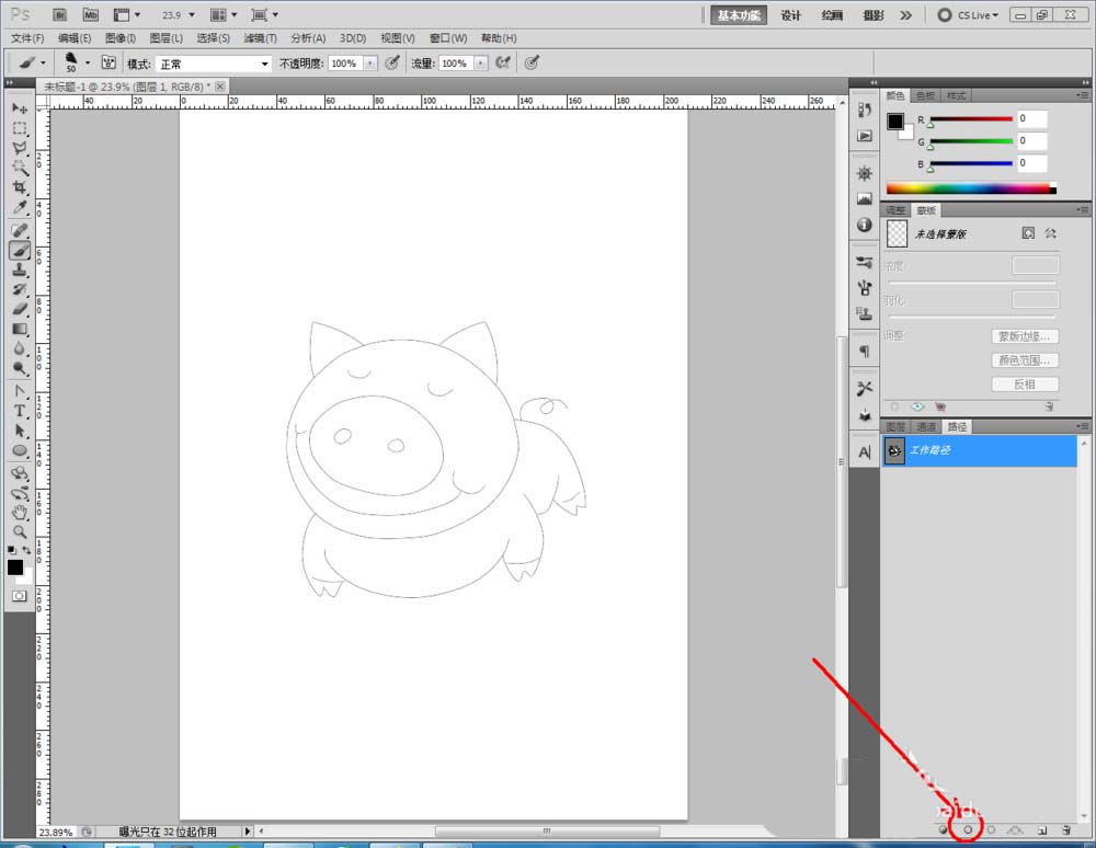 6、設(shè)置好畫筆參數(shù)后,點擊【用畫筆描邊路徑】,完成對卡通豬圖案的描邊操作。切換回圖層欄,按圖示使用【魔棒工具】和【油漆桶工具】對圖案進行填色,這樣我們的卡通豬圖案就全部制作完成了。