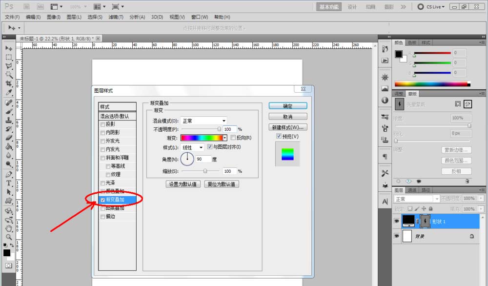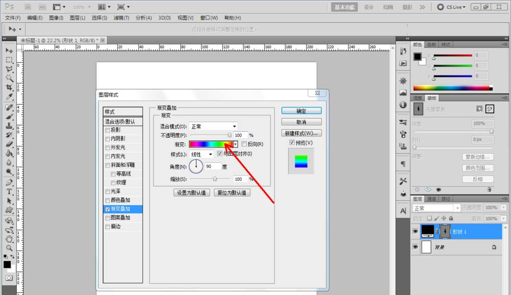 3、鼠標(biāo)雙擊形狀圖層空白區(qū)域,彈出圖層樣式設(shè)置欄,勾選【漸變疊加】,按圖示將漸變顏色設(shè)置為彩色漸變后,點(diǎn)擊【確定】,制作出第一個(gè)彩色音符(如圖所示);