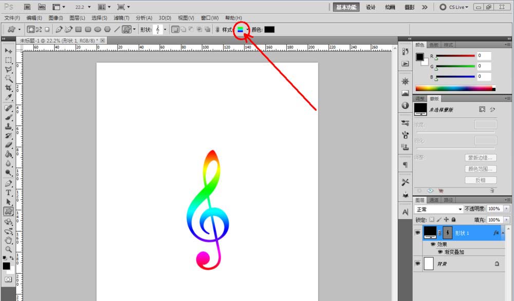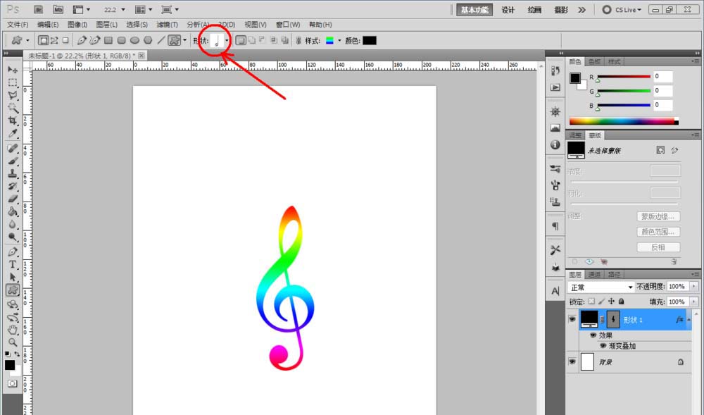 4、點(diǎn)擊【自定形狀工具】,點(diǎn)擊【樣式】將樣式選擇為我們剛剛創(chuàng)建好的彩色漸變樣式后,點(diǎn)擊【設(shè)置待創(chuàng)建的形狀】按圖示分別選擇不同的音符圖案并在作圖區(qū)域創(chuàng)建出來;