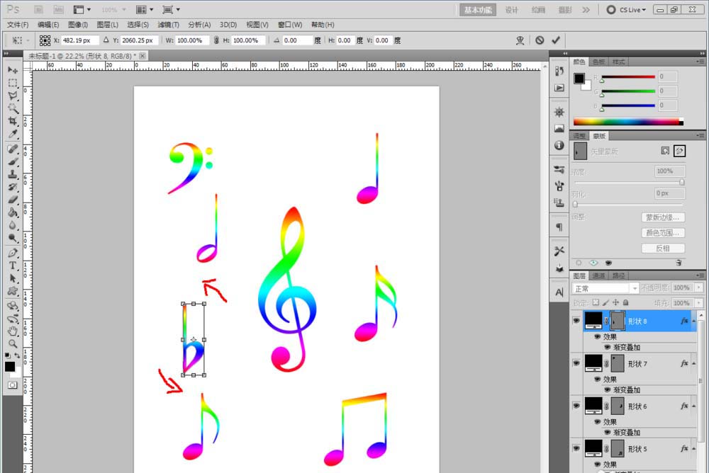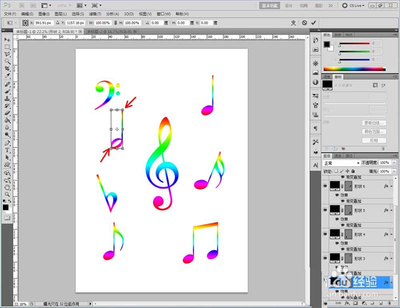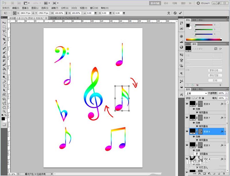 5、創(chuàng)建出所有彩色音符圖案后,按住鍵盤【Ctrl+T】,分別對(duì)各個(gè)音符進(jìn)行縮放和旋轉(zhuǎn)操作,調(diào)整好各音符間的位置關(guān)系,這樣我們彩色音符圖案就全部制作完成了。