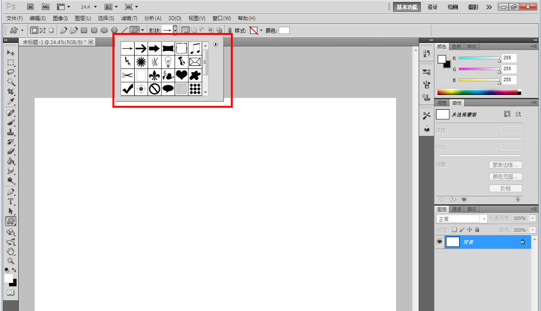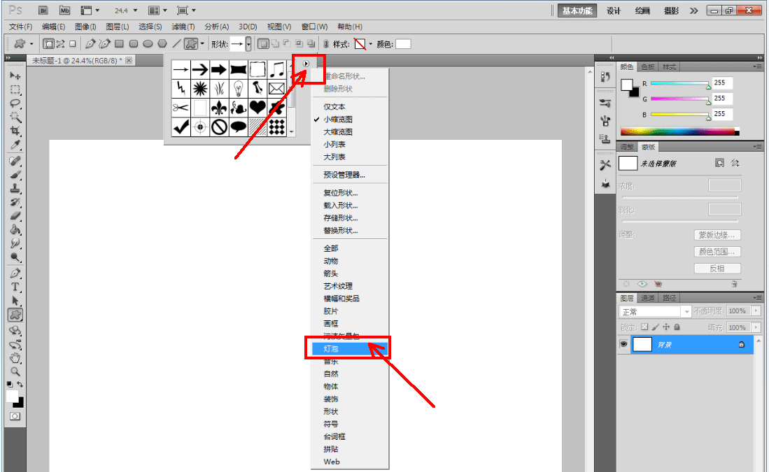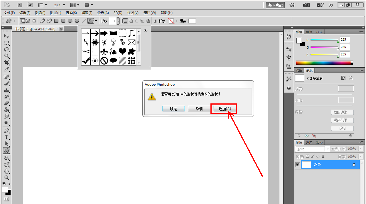2、點(diǎn)擊【自定義形狀工具】,按圖示點(diǎn)擊樣式-【燈泡】,點(diǎn)擊【追加】將燈泡圖案追加到圖案選項(xiàng)欄中;
