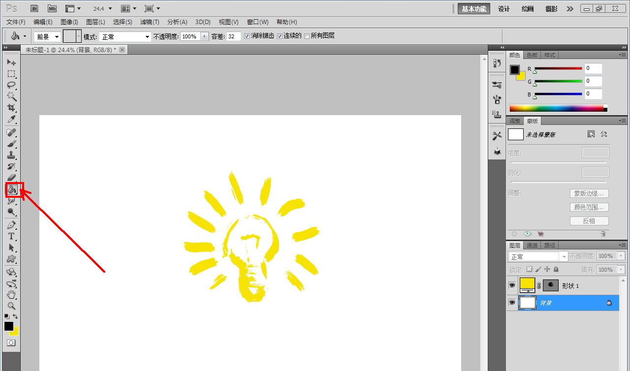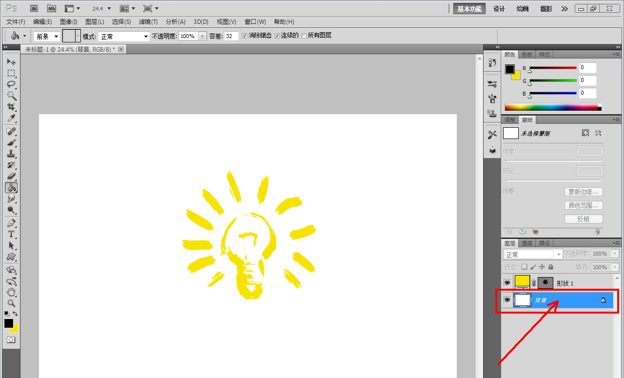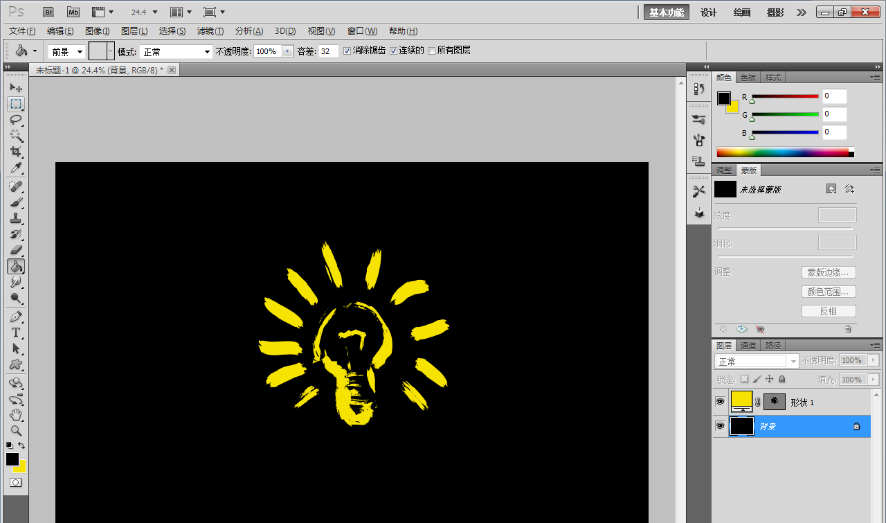 4、點(diǎn)擊【油漆桶工具】,將前景色設(shè)置為:黑色后,選中背景圖層,將背景圖層填充為黑色即可。以上就是關(guān)于ps創(chuàng)意燈泡快速制作方法的所有介紹。