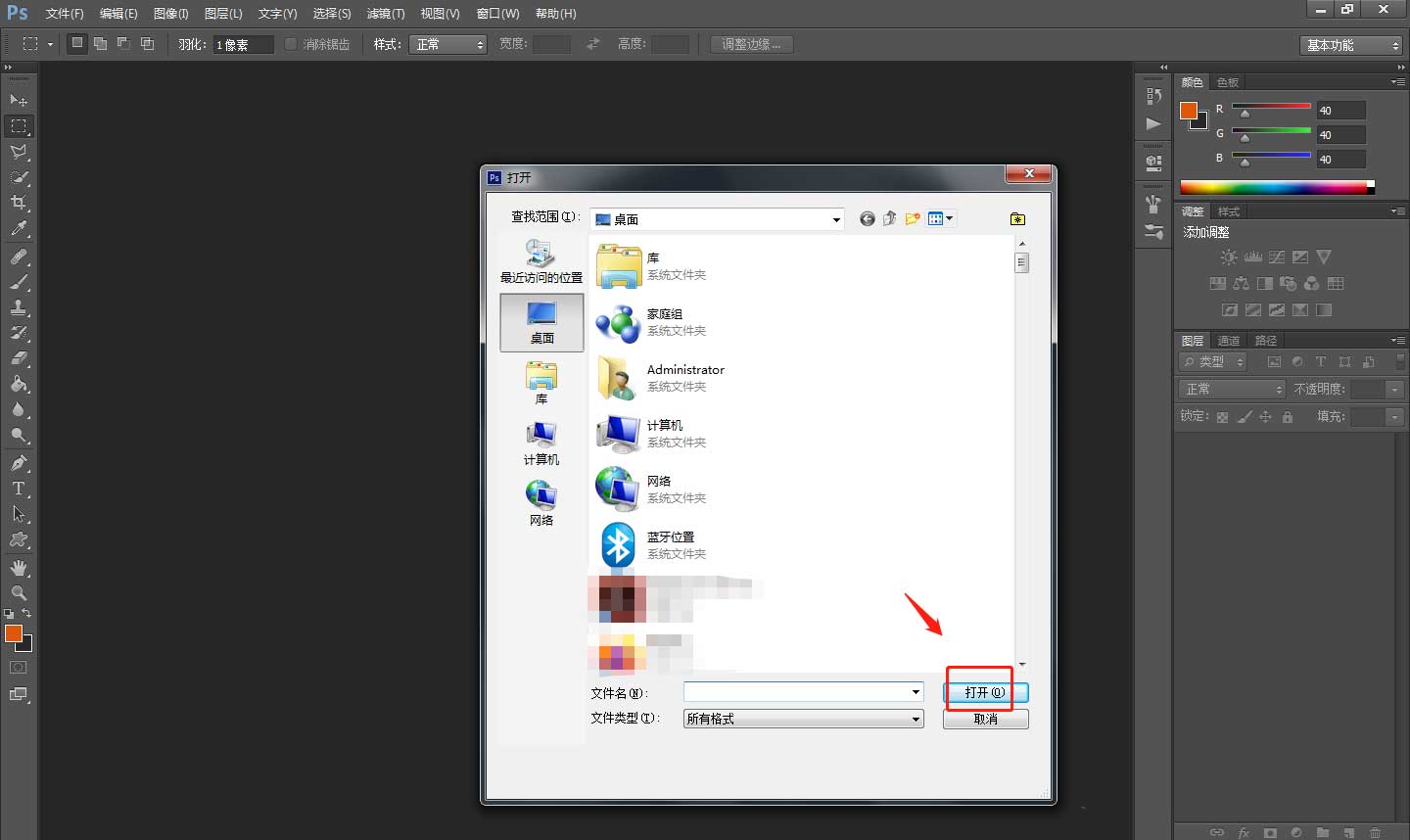 1、首先在電腦中打開PS軟件,使用“Ctrl+O”組合鍵,導(dǎo)入素材文件。