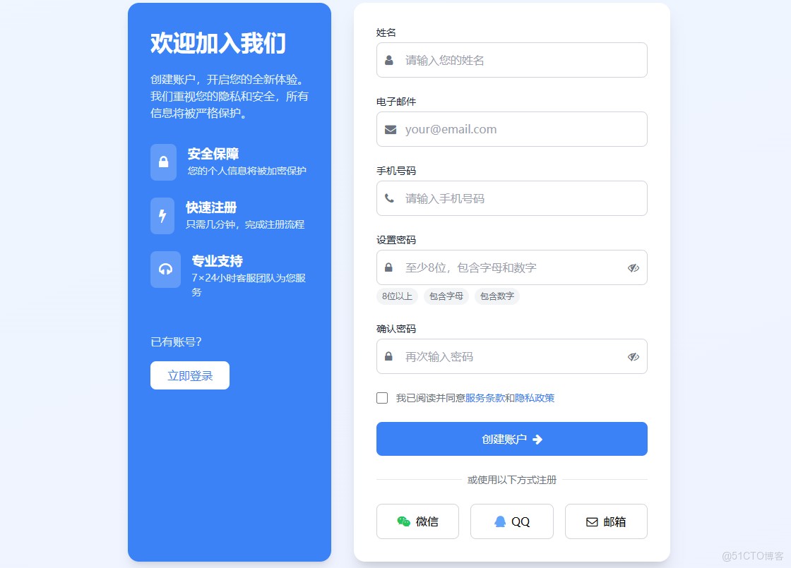 一個現(xiàn)代化、交互友好的注冊表單,具有完整的驗證功能和精美的 UI 設(shè)計。這個表單將包含常見的注冊字段,如姓名、電子郵件、密碼等,并添加適當(dāng)?shù)尿炞C和反饋機制。