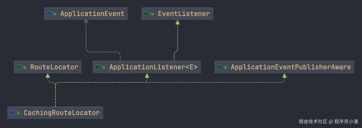 同時(shí),它實(shí)現(xiàn)了 ApplicationListener,通過監(jiān)聽 RefreshRoutesEvent 事件來刷新路由。