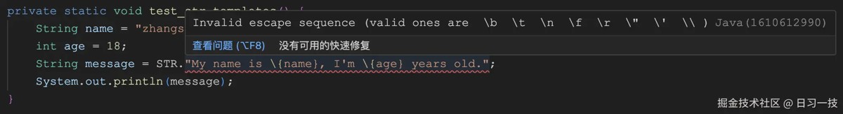 如上所示,JavaScript 通過反引號 ` 來定義字符串模板,而 Java 21 則引入了一個叫做 模版表達式(Template expressions) 的概念來定義字符串模板。下面是一個簡單示例: