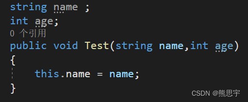 這個是常用的功能,如下圖,熟悉的可以直接跳過,假設(shè)當(dāng)前類有一個全局變量和當(dāng)前方法中的參數(shù)名一模一樣的時候,Visual Studio 就會提示異常,因?yàn)橄到y(tǒng)不知道你到底要給誰賦值,按 C# 的編程規(guī)范來說,全局變量最好第一個字母用大寫,當(dāng)然你也可以用小寫,在遇到下面的這種情況時,只要前面加一個 this,系統(tǒng)就知道左邊的 name 是當(dāng)前類的成員,而右邊的 name 則是方法的參數(shù)。