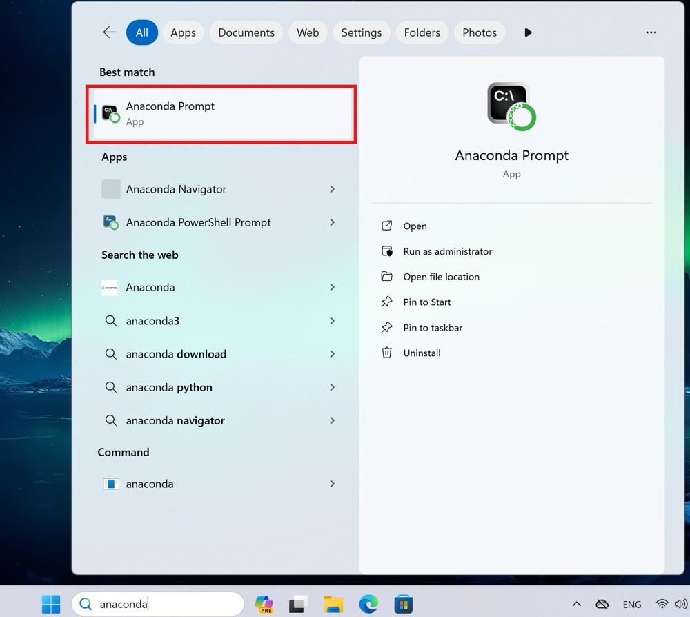 第十二步:用search 搜索anaconda prompt并打開,輸入Conda -V,出現(xiàn)conda version則顯示安裝成功