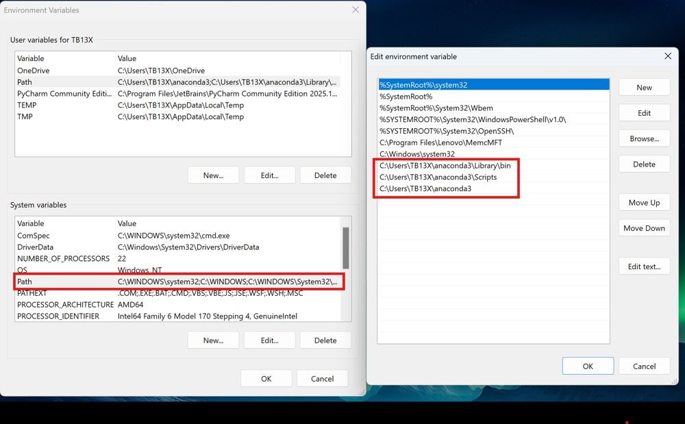 第十一步:因為剛剛在安裝的時候選擇了把a(bǔ)naconda加入環(huán)境變量,所以在system的path里應(yīng)該會顯示這三個文件夾地址。如果沒有這三個文件夾,則需要手動復(fù)制對應(yīng)的文件夾地址到path中,最后再點(diǎn)OK保存。
