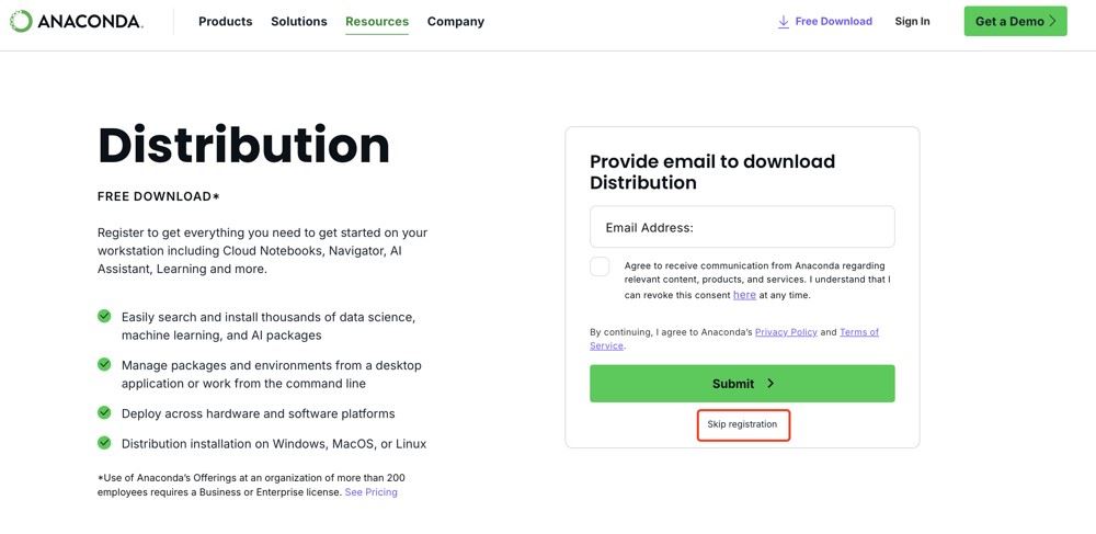 第一步:進(jìn)入anaconda官網(wǎng)Download Anaconda Distribution | Anaconda,點(diǎn)擊中間的Skip Registration。