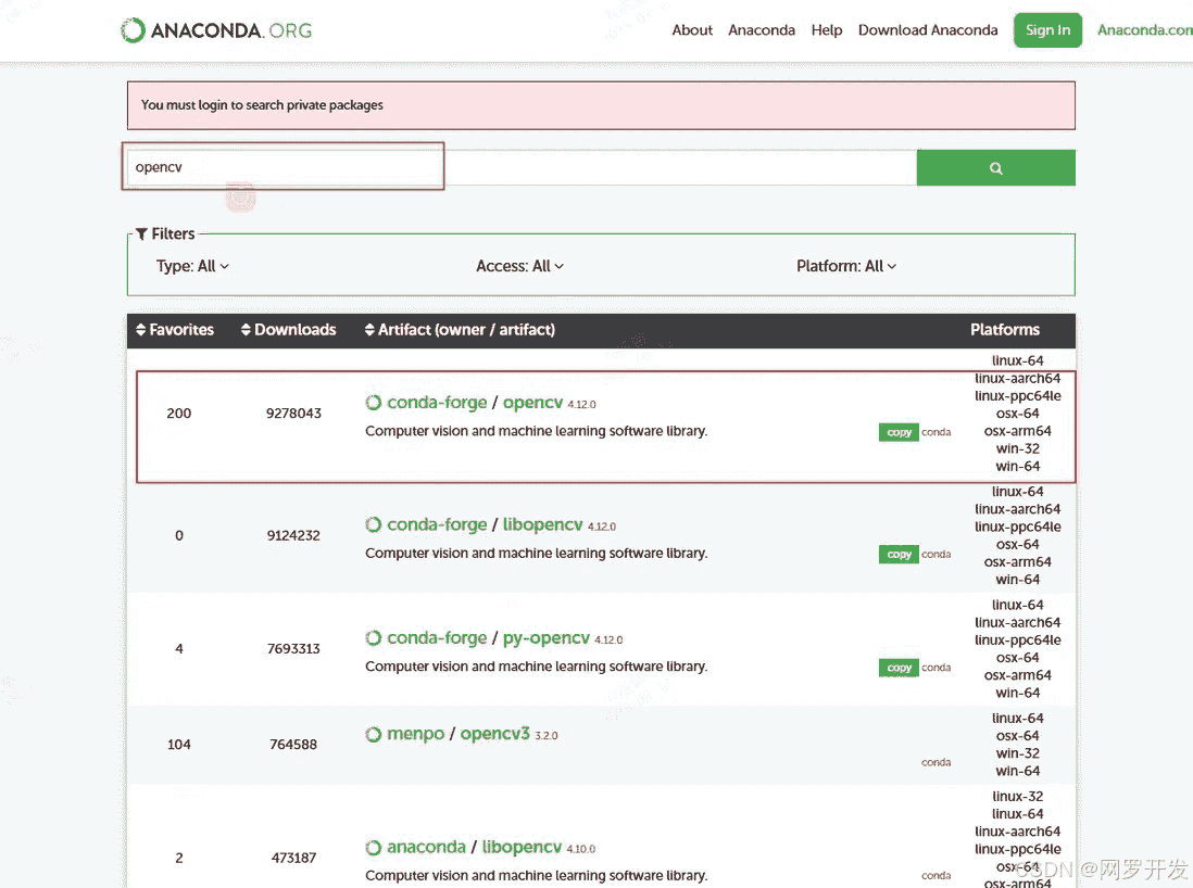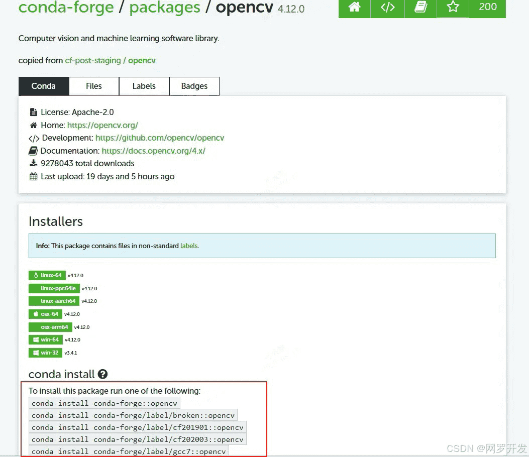 去 conda 的官網(wǎng)搜索你要安裝的包,比如 opencv,然后里面會有 conda 安裝opencv的方式。cv2 是 opencv 安裝后,你使用的時(shí)候的名字,比如 import cv2; print(cv2.version),不是安裝包的名字。
