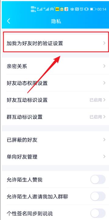 5、進(jìn)入隱私設(shè)置頁面,點(diǎn)擊【加我為好友時(shí)的驗(yàn)證設(shè)置】