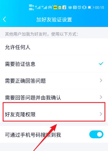 6、進(jìn)入加好友驗(yàn)證設(shè)置,點(diǎn)擊【好友克隆權(quán)限】