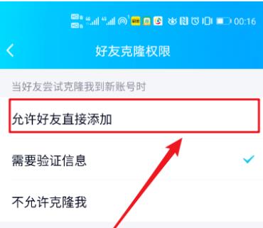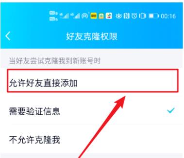 7、進(jìn)入好友克隆權(quán)限設(shè)置頁面,點(diǎn)選【允許好友直接添加】即可