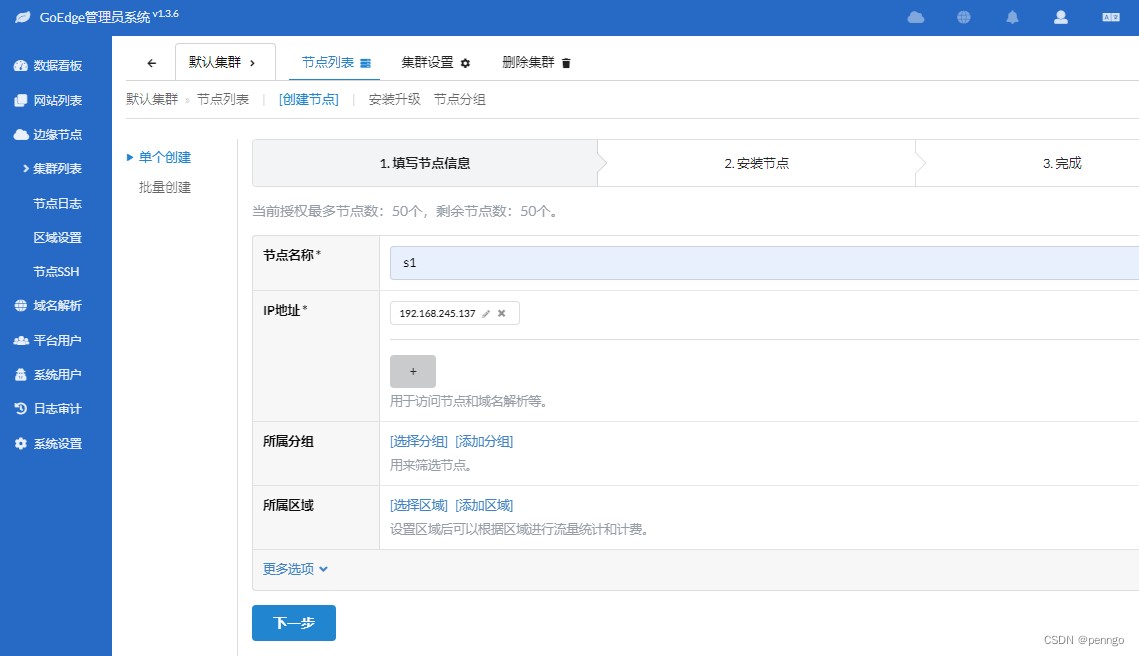 在”集群列表” – “節(jié)點列表” – “創(chuàng)建節(jié)點” 填節(jié)點信息;