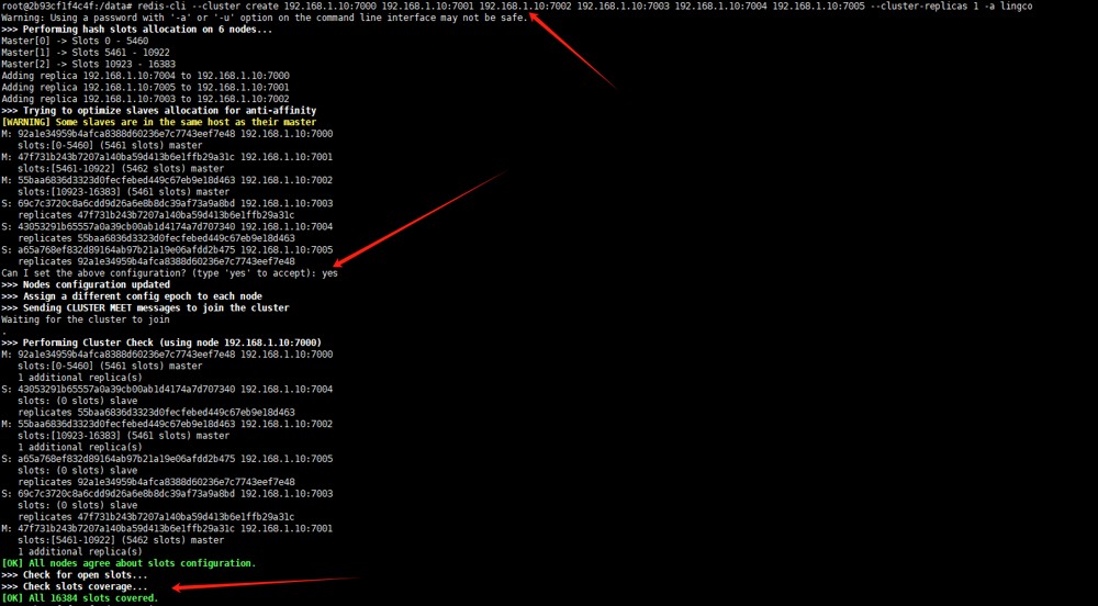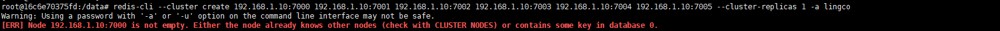 redis-cli --cluster create 192.168.1.10:7000 192.168.1.10:7001 192.168.1.10:7002 192.168.1.10:7003 192.168.1.10:7004 192.168.1.10:7005 --cluster-replicas 1 -a lingco