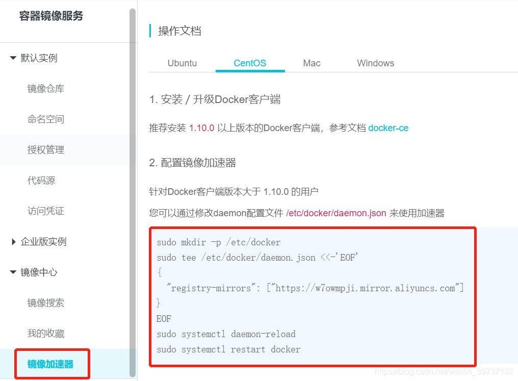 首先注冊(cè)自己的阿里云賬號(hào),登錄控制臺(tái)搜索“容器鏡像服務(wù)”,點(diǎn)擊鏡像加速器,如上圖所示,顯示操作步驟
