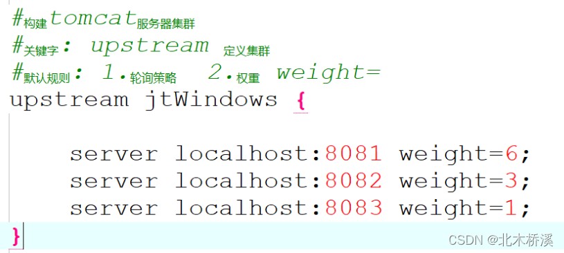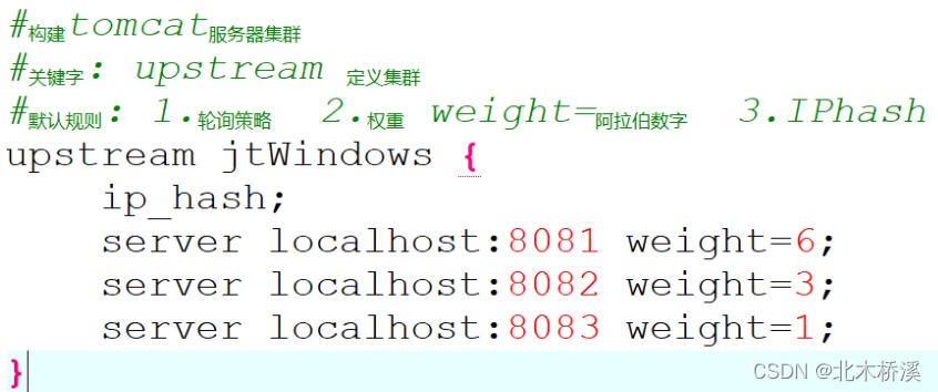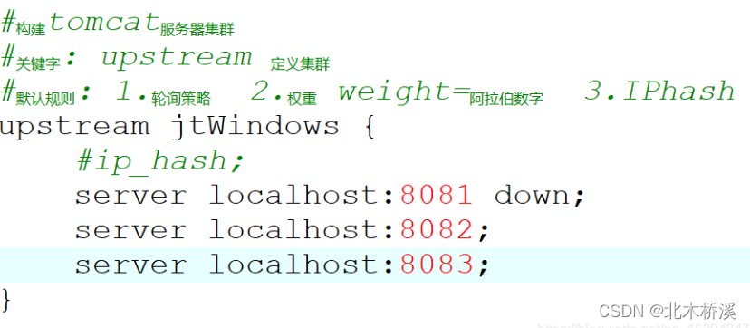 說明: 由于公司內(nèi)部物理服務(wù)器的處理能力可能有高有低.,所以需要讓高性能的服務(wù)器處理更多的請求. 采用權(quán)重的策略配置:
