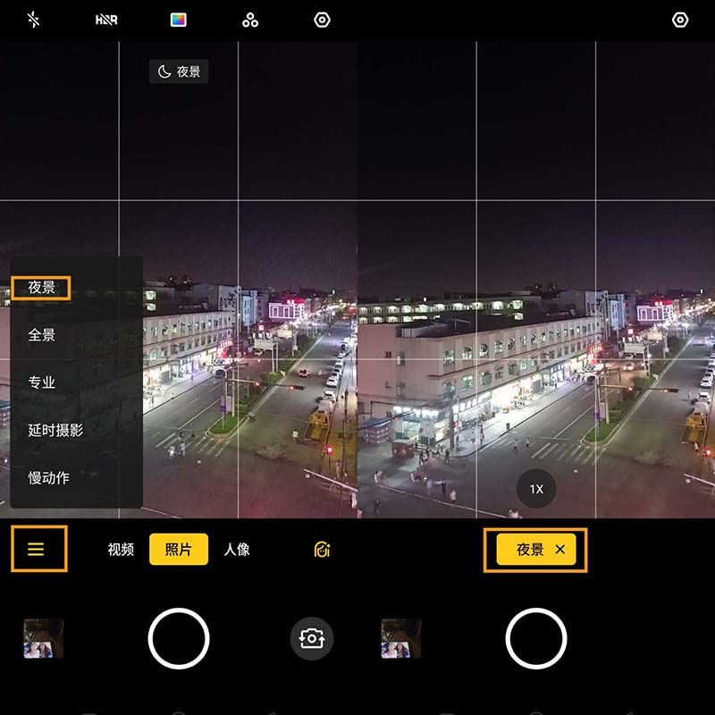 2、然后點擊三橫—選擇夜景,這樣就已調(diào)試到夜拍模式,根據(jù)周圍環(huán)境、角度、光線來調(diào)試點擊觸屏拍照,因晚上光線不比白天光線好,拍夜景時需要幾秒來聚焦才能拍出更好看的照片,所以在沒有完成拍攝的情況下不建議移動手機。